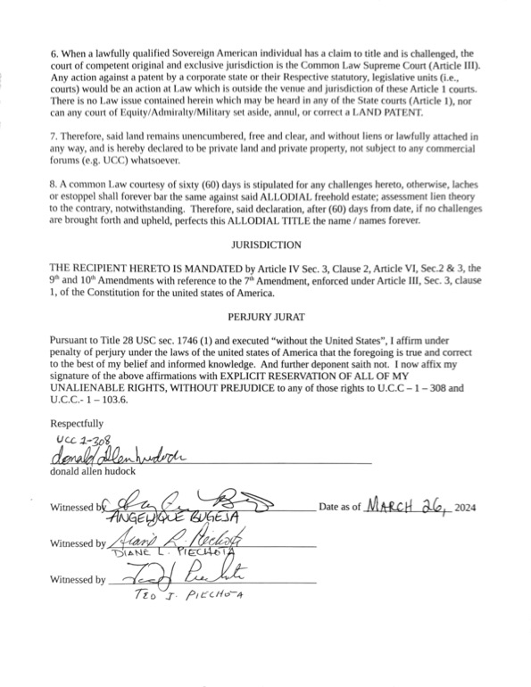 Failure to make a lawful claim, as indicated herein, within sixty (60) calendar days of this notice, will forever bar any claimant from any claim against my allodial patent estate as described herein and will be a Final Judgement.