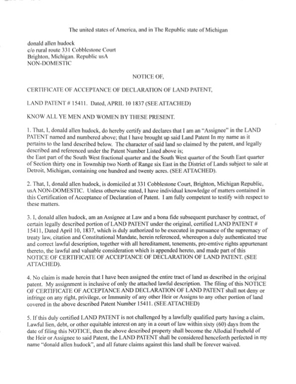 Failure of any lawful party claiming an interest to bring forward a lawful challenge to the Certifie of Acceptance of Declaration of Land Patent and the benefit of Original Land Grant/Patent, as stipulated herein, will be lached and estoppel to any and all parties claiming an interest forever.
